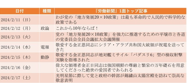 2月15日付1面には、左半分に金正恩(キム・ジョンウン)国務委員長が地対艦(朝鮮語原文は「地上対海上」)ミサイル「パダスリ(海鷲)6」型の検収射撃実験を指導したとの記事、右半分に重要軍需工場を現地指導したとの記事が掲載された。金正恩による複数の動静が同時に掲載される場合には、ページをまたいで報道するか、第1面の上下に掲載されるかが常であり、1ページで左右に分割掲載して2つの動静報道が同じように重要だと示すものは初見である。そこに深い意味はなかろうが、読者としては斬新なレイアウトと映る。