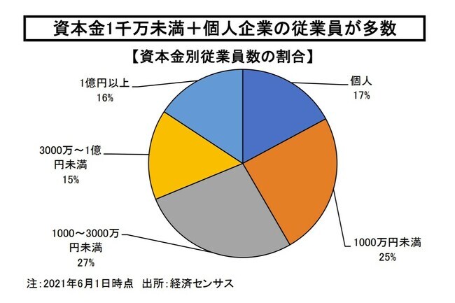植田総裁は中小企業の賃上げについて、その原資となる収益の状況は法人企業統計季報などを見ると改善しているとの見解を示した。しかし、中小企業の多くは法人企業統計季報の対象外である資本金1000万円未満の企業、または個人企業だ(総務省「経済センサス」)。また法人企業統計季報上で定義される資本金1000万円から1億円未満の企業はサンプル調査であり、精度は幅をもって見る必要もある。なお、「日銀短観」は資本金2000万円以上からが調査対象であり、対象範囲がさらに狭まる(図表1)。