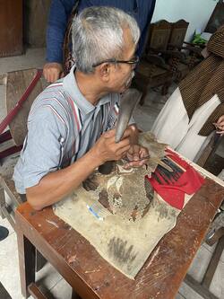 続いて、彼らは、地元ジョグジャカルタ州で協力してくれそうな人を探し始めた。ほどなくして、州の元文化局長で、プロの人形遣い(ダラン)でもあるキ・ムブルス・エコ・スリョ(以降エコ氏)にコンタクトを取り、協力を要請した。エコ氏は人形遣いとしての役目を引き受けるだけでなく、人形作家やガムランチームを探してくれることになった。筆者からは、絵画のプロジェクトと同様に、物語の翻訳文と桃太郎の歌の音源を参考に渡した。もちろん、Googleで桃太郎の物語を調べないでほしい、というお願い付きだ。