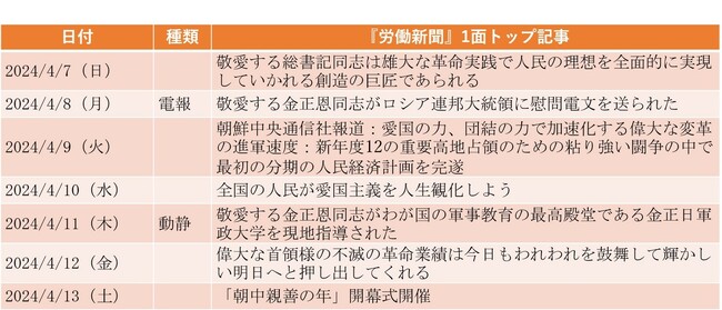 4月8日付1面トップには、金正恩(キム・ジョンウン)国務委員長によるロシアのウラジーミル・プーチン大統領宛の慰問電文が紹介された。「慰問電文」は、天災などに見舞われた各国の首脳に対して送られるものであり、今回は5日にロシア南部のオレンブルク州で発生した大規模な洪水に対して見舞いの言葉を述べている。金正日(キム・ジョンイル)政権期から金正恩政権初期にかけては一貫して金永南(キム・ヨンナム)最高人民会議常任委員会委員長が送付していた。