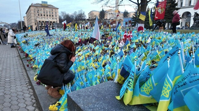 キーウ中心部の独立広場を訪ねると、来るたびに増えていた戦没者を弔う小旗が、もはや地面が見えないほど芝生をびっしりと埋め尽くしていた。