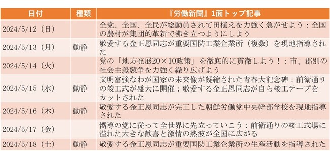 5月15日付は、金正恩(キム・ジョンウン)国務委員長出席のもと挙行された「前衛通り」の竣工式について4ページかけて報じた。平壌(ピョンヤン)市北部に建設された「前衛通り」は80階建てのタワーマンションも擁しており、「敬愛する父」であり「偉大な親」である金正恩が格別な関心を払ってきたことが称えられた。「歓迎曲が響くなか、父なる元帥様が愛するお子さまとともに竣工式場に到着するや、爆風のような『万歳!』の歓声が上がった」として、江東(カンドン)総合温室竣工・操業式以来2カ月ぶりに娘の同行が確認された。同日付第5面には、金正恩が「重要武装装備の生産実態を了解」したとの記事が掲載されたが、ここに娘は同行していない。