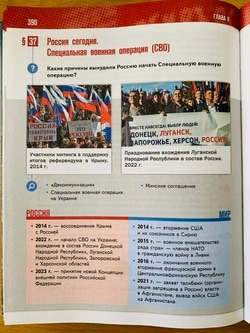 これに対し、プーチン政権誕生後はロシアが国力を回復し、それに伴う欧米との対立に力点が置かれている。著者は、中央が地方を統治する「権力の垂直構造」がプーチン大統領によって構築されるなどし「ロシアは21世紀に入り安定した」と説明の上で、「力を取り戻し、国際舞台での役割を回復したロシアの更なる発展を邪魔する勢力が拡大」、クリミアなど「歴史的な土地がロシアに返還された」、それに伴う対露制裁など「西側による挑戦は我が国をより強固するのは疑いない」などと記している。このようにエリツィン時代とプーチン時代を比較し、後者を評価する記述は、メディンスキー大統領補佐官が監修に関与した『ロシア史:20世紀初頭から21世紀初頭』でも見られるが、西側との対立やロシアの西側批判などは抑制気味に記されている。新しい歴史教科書では、長期化する「特別軍事作戦」を正当化するプーチン大統領の主張が多数盛り込まれたと言える。
