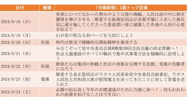 8月23日付1面トップは、北朝鮮の水害被害に際してラオスのトーンルン・シースリット主席から慰問電文が送られたことに対して金正恩(キム・ジョンウン)国務委員長が答電を送ったことを伝えた。『労働新聞』が外国首脳からの「慰問」を伝えたのはロシアのウラジーミル・プーチン大統領に次いで2例目となった。