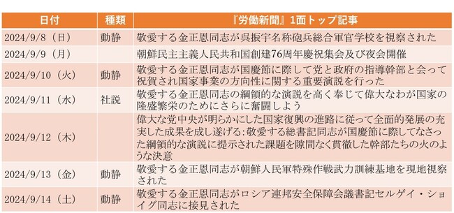 建国76周年慶祝集会は金正恩国務委員長の出席がない地味な祝われ方だったが、『労働新聞』では元日以来となる習近平・中国国家主席からの祝電が紹介された。ロシアのショイグ安全保障会議書記訪朝では、金正恩は専用車の助手席に乗せ自らハンドルを握る厚遇だった。日本の自民党総裁選については付随的に一言触れた記事があったが、日朝平壌宣言の当事者・小泉純一郎元首相の息子である小泉進次郎元環境相に『労働新聞』が言及したことはいまだない。【『労働新聞』注目記事を毎週解読】