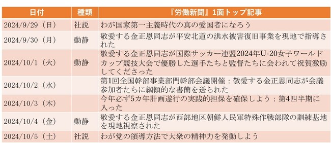 10月1日付1面トップは、金正恩(キム・ジョンウン)国務委員長が、U-20(20歳以下)女子ワールドカップで優勝した自国チームの選手、監督、金日国(キム・イルグク)体育相らと会って成果を称えたことを報じた記事であった。金正恩は、「スポーツは国の進歩と民族の優秀性を育む上で非常に大きな意味を持つ」とし、国際試合での成果は「人民をいっそう団結させ、活気に満ちた闘いの道へと力強く促している」などと述べた。全体として、対外的な国威発揚よりも、対内的な国民統合を重視した発言だと言える。