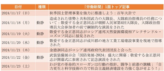 11月18日付は、金正恩が第4回大隊長、大隊政治指導員大会で演説したことについて3ページ半にわたって報じた。演説では「日本」を単独で名指ししてはいないものの、「米日韓」に対して4回もの言及があった。