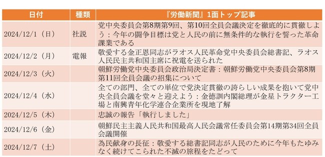 北朝鮮は10月の憲法改正で韓国を「徹底的な敵対国」と規定し、尹政権に対する批判を繰り返してきたが、今回の戒厳令や弾劾訴追について7日時点で沈黙を守っている。対韓政策の行方に関しては、年末から来年1月にかけての党中央委員会全員会議と最高人民会議における決定が注目される。【『労働新聞』注目記事を毎週解読】