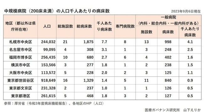 東京には医師が大勢いて、病院も多いと考えられているが、状況は複雑だ。大学病院や大病院は多いが、肺炎や胃腸炎などですぐに入院できる中小病院は少ない。表1は、主要都市における中規模病院(200床未満)の人口1000人あたりの病床数を示す。文京区をはじめ、都内で不足しているのが一目瞭然だろう。