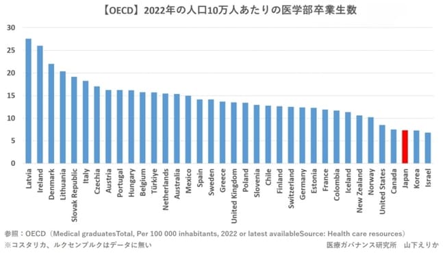 日本の人口あたりの医学部定員は、経済協力開発機構(OECD)加盟38カ国中、イスラエル(6.8人)、韓国(7.3人)に次いで少ない。トップのラトビア(27.6人)の4分の1だ(図1)。最近、韓国は医学部定員を大幅に増員することを決めた。医師過剰を喧伝する日本とは対照的だ。
