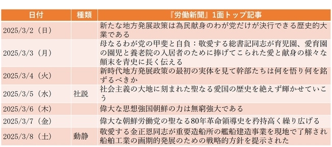 3月8日付の第2面下段には金正恩(キム・ジョンウン)国務委員長が咸鏡(ハムギョン)北道鏡城(キョンソン)郡で建設中の温堡(オンポ)勤労者休養所を現地指導したとの記事が掲載された。朝鮮労働党中央委員会の「指導幹部」である李煕用(リ・ヒヨン)、金才龍(キム・ジェリョン)が同行した。