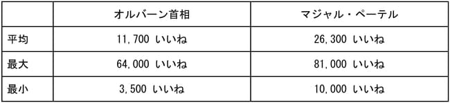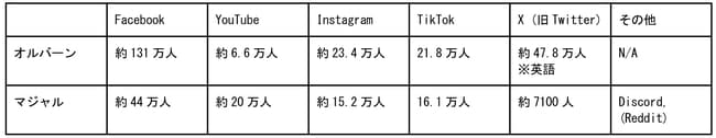 オルバーン首相とマジャルが保有するSNSの一覧とそのフォロワー・チャンネル登録者の一覧は、表1に示されるとおりである。