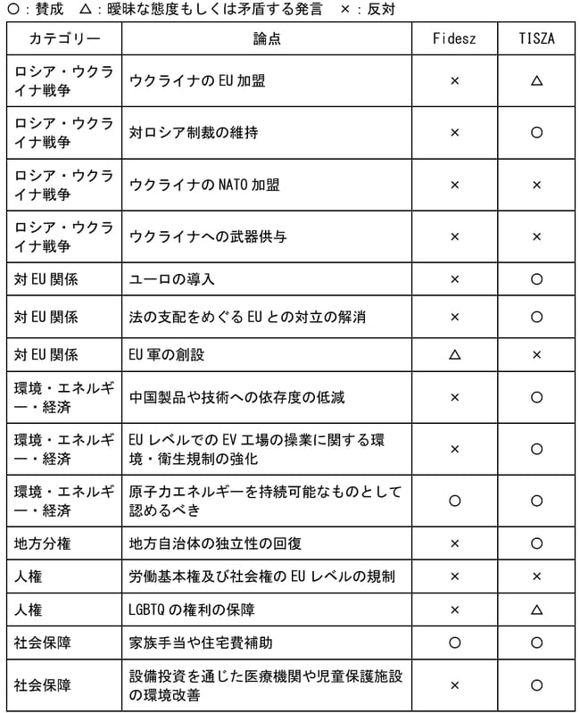 他方、与党フィデスとティサ党の政策的な立ち位置が近い、もしくは政策の違いがはっきりとはしていない分野も多い。ロシア・ウクライナ戦争に関して、両党はともにウクライナのNATO(北大西洋条約機構)加盟や武器援助に反対している。ウクライナのEU加盟については、フィデスが反対する一方でティサは加盟そのものには賛成だが、バルカン諸国が先に加盟すべきだという留保もつけている28。