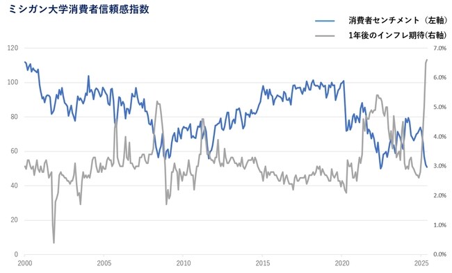 関税引き上げによって輸入業者の仕入れコストが上昇し、それが価格に転嫁されていくと最終的に消費者が支払う価格が上昇する。インフレの長期化が予想されるとFRB(米連邦準備制度理事会)は簡単には政策金利を下げられず、インフレの継続が予想されると消費者のマインドも下がりやすい。