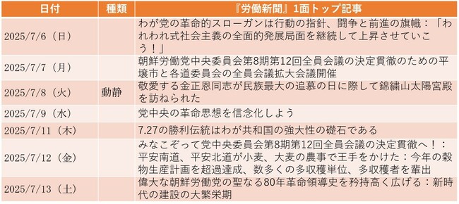 7月8日付1面トップは、故・金日成(キム・イルソン)主席死去31年に際して、金正恩(キム・ジョンウン)国務委員長が錦繍山(クムスサン)太陽宮殿を訪問したことについて報じた。掲載写真では多くの随行者が確認できるが、記事では、朝鮮労働党中央委員会政治局常務委員会委員として朴泰成(パク・テソン)、崔龍海(チェ・リョンヘ)、趙甬元(チョ・ヨンウォン)の三氏だけが紹介された。