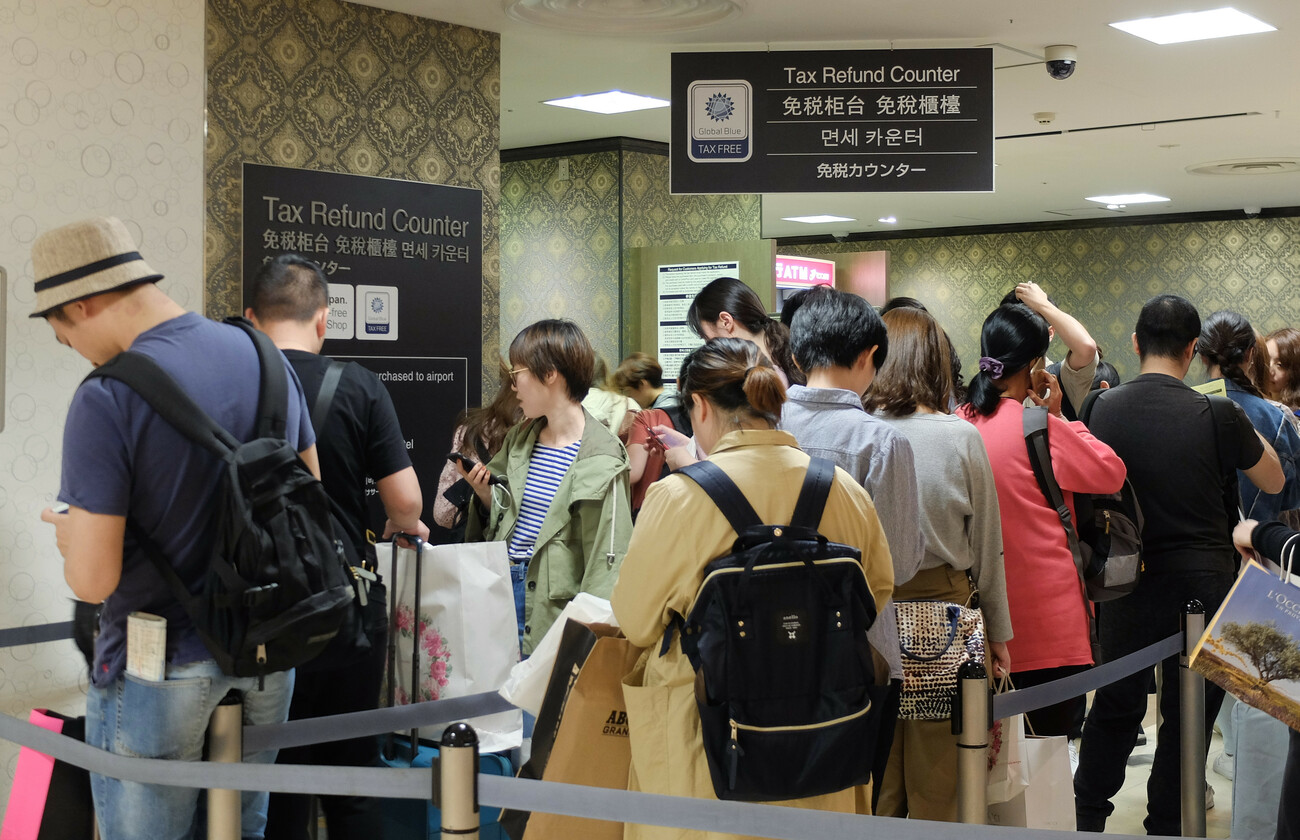 百貨店の売上は好調に見えるが、実はインバウンド売上は減少に転じている[百貨店の免税カウンターに並ぶ訪日外国人旅行者ら](C)時事