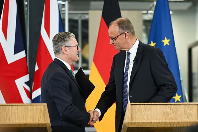 まずは安全保障での連携が前面に出たが、友好条約の対象分野は幅広い[エアバス・ディフェンス・アンド・スペース社の工場で記者会見を開いたスターマー英首相(左)とメルツ独首相(右)=2025年7月17日、イギリス・ロンドン近郊のハートフォードシャー州](C)EPA=時事