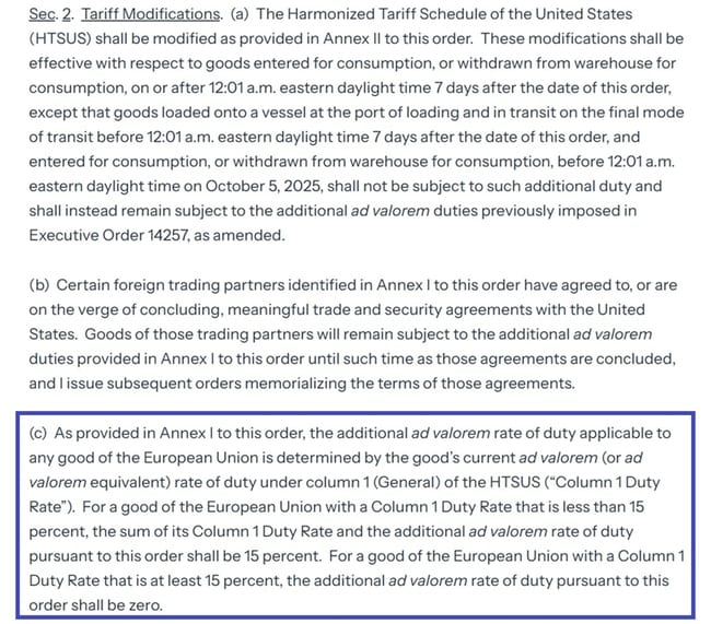 しかし、ドナルド・トランプ大統領が7月31日に相互関税見直しをめぐって署名した大統領令のほか、米国国土安全保障省の税関・国境取締局 (CBP)が8月4日に公表したシート、ホワイトハウスが8月6日に官報に掲載した内容を踏まえれば、「特例措置」に該当するのは、欧州連合(EU)のみ。ここに記されなかった日本は、新たな相互関税が発動する8月7日午前0時1分から、15%以下並びに15%以上の品目に、追加で15%の関税が課されることになった。
