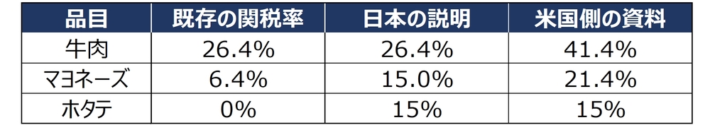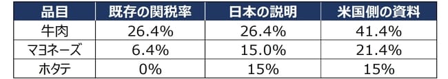 例えば、牛肉の場合は8月6日までの税率は26.4%で、日本政府の説明では15%の上乗せなしで26.4%のままとなる予定だった。しかし、米国の資料に基づけば、15%が追加され、41.4%に引き上げられる。一方で、関税が15%以下のマヨネーズは、既存の6.4%に15%上乗せされ、21.4%に。関税ゼロのホタテは、15%となる。