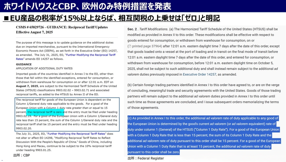 各国ともこうした摩擦が大なり小なり続いているとはいえ、合意文書を作成する予定のEUとは、7月31日の相互関税見直しに関する米大統領令で特例措置が認められている事実は無視できない。