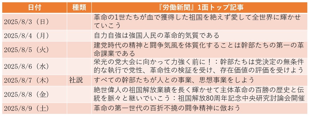 金正恩(キム・ジョンウン)国務委員長の動静報道がないばかりか、対外談話の発表なども見られず、落ち着いた1週間であったが、8月15日に「祖国解放」80周年を控えているため、全体としては「革命の1世」「革命の第一世代」といった用語が目立った。