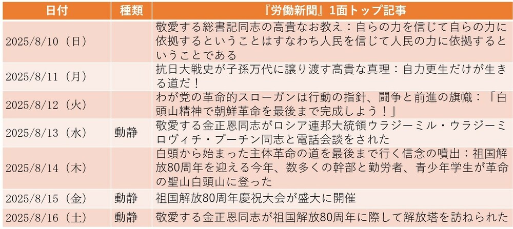 8月15日付は、前日14日に平壌(ピョンヤン)で開催された「祖国解放80周年慶祝大会」について大きく報じた。金正恩(キム・ジョンウン)国務委員長の横にはロシアのヴャチェスラフ・ヴォロージン国家院(下院)議長が立った。慶祝大会には朝鮮労働党と政府の幹部、抗日革命闘争縁故者の遺児、愛国功労者、革命学院の教職員、生徒らが参加したほか、訪朝中のロシア国家院代表団と文化省の代表団、大使を含む在北朝鮮ロシア大使館員が招待されたという。