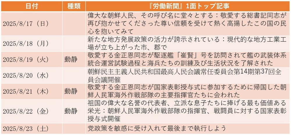 8月22日付は、金正恩(キム・ジョンウン)国務委員長の「燃えるような宿願と情け深い呼びかけ」によって開催された朝鮮人民軍海外作戦部隊の指揮官と戦闘員に対する国家表彰授与式について大きく報じた。