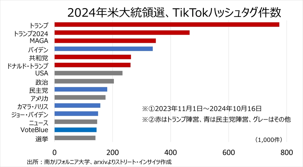 もう1つは、ショート動画アプリのTikTokだ。2024年の大統領選において若手の支持層を獲得する上で、TikTokがトランプ陣営に大きな追い風を送ったことは明らかである。南カリフォルニア大学の分析によると、TikTokリサーチAPIと外部ツールを使って収集された大統領選関連の上位5種類のハッシュタグのうち、トランプ関連が4種類を占めた。TikTokが選挙戦において、いかにトランプ氏を宣伝する上で効果を発揮したかが窺える【チャート1】。