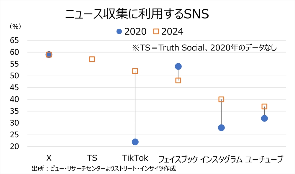 米国でのTikTok利用者数は、1億7000万人超と言われる。ピュー・リサーチ・センターによれば、ニュースの収集先として、TikTokはXやトゥルース・ソーシャルに続き、SNSのなかで3位に位置するだけでなく、割合も2020年の22%から52%へ急伸。トランプ政権が中間選挙での勝利を引き寄せる上で重要な資源となり、活用しない手はない【チャート2】。
