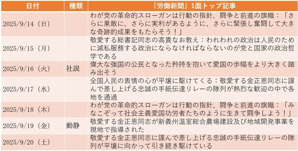 9月19日付は、金正恩(キム・ジョンウン)国務委員長が新義州(シニジュ)温室総合農場の建設現場を現地指導したことについて第1面で報じた。「国境地域を現代性と独創性、民族性が具現された発展的な地域に変貌させようとする」金正恩の構想に基づき、鴨緑江の中洲である威化島(ウィファド)地区には温室、野菜加工工場、貯蔵施設、研究拠点のほか住宅などを含む「大農場都市」が建設中である。