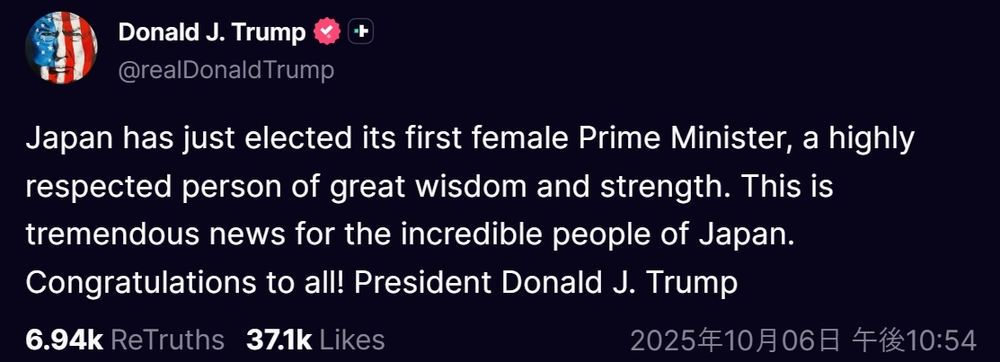 日本で10月4日に自民党総裁選の投開票が行われ、高市早苗氏が選出された。その2日後、トランプ氏はトゥルース・ソーシャルで「卓越した知恵と強さを備えた、非常に尊敬される人物である」と祝意を表明。スコット・ベッセント財務長官も続いて、トランプ氏の投稿を紹介するX(旧ツイッター)をリポストする形で高市氏へお祝いのメッセージを投稿した