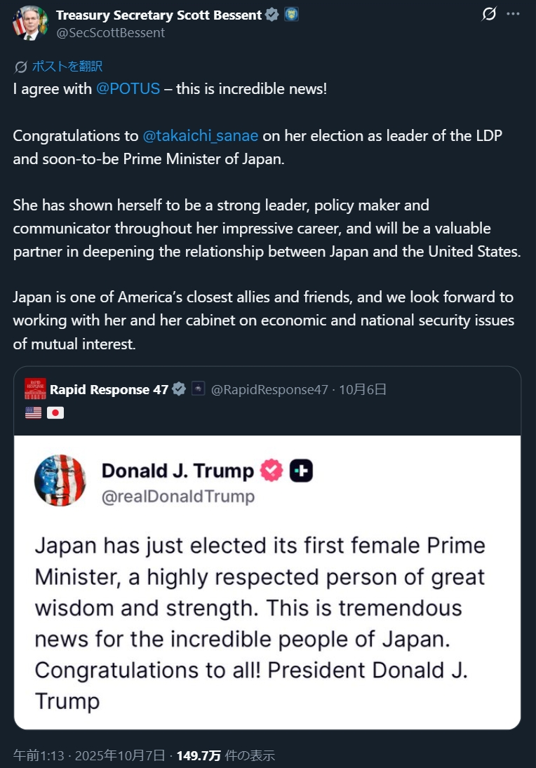 【トランプ氏とベッセント氏、高市新総裁へのお祝い投稿】