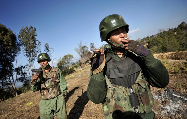 北部カチン州などレアアース産出地域の軍事政権による支配を米国が支援する可能性も指摘される[前線で警戒にあたるカチン独立軍(KIA)の兵士たち=2013年1月22日、ミャンマー・カチン州](C)REUTERS/Kaung Htet