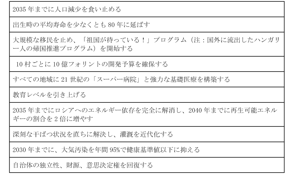 第二に、フィデスの戦術が「敵を作り否定する」ことそのものに偏り、手段が目的化してしまっている点であろう。ティサ党やEU、その他の政敵を繰り返し攻撃することで短期的には支持層を結束させることができても、長期的なビジョンを示せなければ、有権者の飽きにつながってしまう。これに対して、ティサ党は汚職対策やEUとの関係改善をはじめとして、曖昧な部分が多いながらも、フィデスと比べると具体的なビジョンを示しており、8月には、選挙公約を発表してこなかったフィデスとは異なり10の公約を発表した(表1)。その結果、フィデスの手法の古さとティサ党の新鮮さが対比されうる状況が生まれている。
