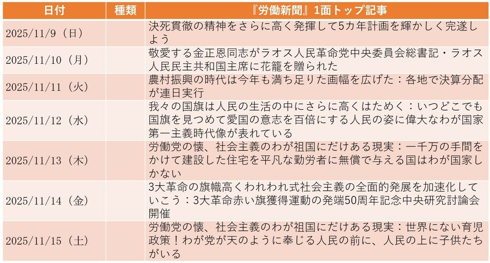 「労働党の懐、社会主義わが祖国にだけある現実」と題する第1面掲載の新連載が始まった。初回となる11月13日付は、「一千万の手間をかけて建設した住宅を平凡な勤労者に無償で与える国はわが国家しかない」とのサブタイトルで、金正恩(キム・ジョンウン)国務委員長が「国の根本である人民よりも貴重な存在はなく、人民の利益より神聖なものはありません」と述べたことを紹介し、「首領福」(注:首領に恵まれた福)、「党福」(注:党に恵まれた福)が誇示された。この手の記事は資本主義社会との対照で叙述されるのが常套で、「ある資本主義国でワンルームの住宅を持とうとすれば、一般労働者が受け取る賃金を100年あまり貯蓄しなければならない」ことも紹介された。