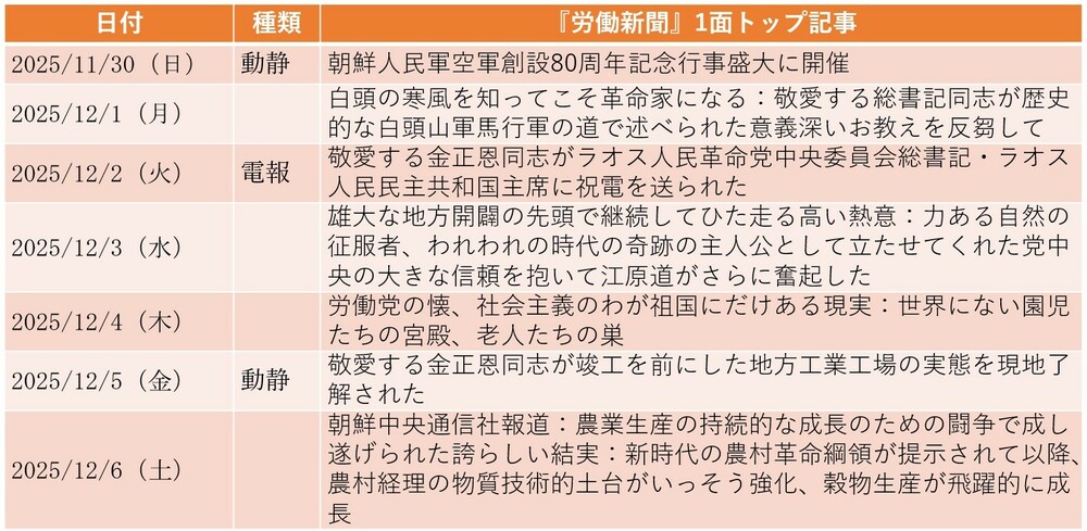 11月30日付は、朝鮮人民軍空軍創設80周年の記念行事が28日に葛麻(カルマ)飛行場で開催されたことについて第1面から4ページかけて大きく報じた。注目点はイベントの中身よりも、金正恩(キム・ジョンウン)国務委員長の娘が約3カ月ぶりに登場したことである。彼女の動静が確認されたのは9月初旬の訪中以来であり、「尊敬するお子さまが同行された」との一文が記事に挿入されたのは、駐朝ロシア大使館への訪問を報じた5月10日付以来となった。