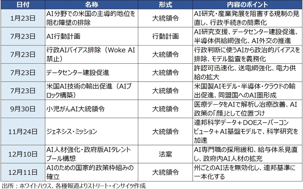 「人工知能(AI)によって世界の先頭に立つべく、あらゆる手段を講じる」――ドナルド・トランプ大統領は7月23日、こう明言した。その言葉どおり、トランプ政権はAIを国家戦略の中核に据え、連邦政府主導の体制を段階的かつ体系的に構築してきた。1月23日の「AI分野での米国の主導的地位を阻む障壁の排除」と題した大統領令を皮切りに、各種の施策は段階的に積み上げられてきた【チャート1】。