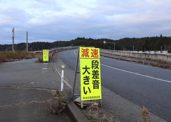 集中豪雨から1年3カ月を経た珠洲市では、町なかの倒壊した建物や瓦礫置き場は片付いて、道路の補修は進んでいる。ただ、解体された家や建物の跡には敷地を囲むブロックだけが残されてまるで遺跡のような様相を呈し、応急処置された道路はパッチワークのようで段差が多く、大型車がたてる音が激しいために「減速 段差音大きい」の看板が至るところに立っている。中心部から少し離れると、地滑りで流れた家や車は手付かずのまま残され、飛び出したマンホールが放置されているところもある。先に述べた隆起で広がった海岸沿いでは、崩れてきた土砂を支えるワイヤーネットはギリギリのところで土を支え、ふたたび豪雨に見舞われたら決壊は避けられないように見えた。