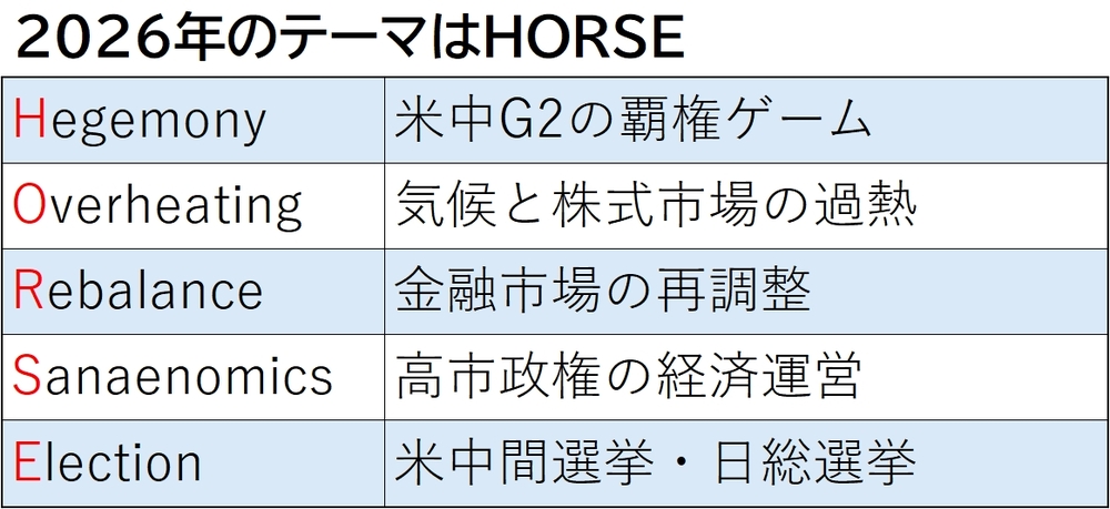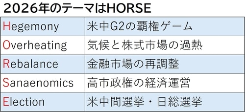 2026年は午年。高市早苗首相の率いる日本は、政治と経済がひとつになった課題に直面することになる。例年同様に英語の頭文字をとって、それらのテーマを「HORSE」と整理しよう。