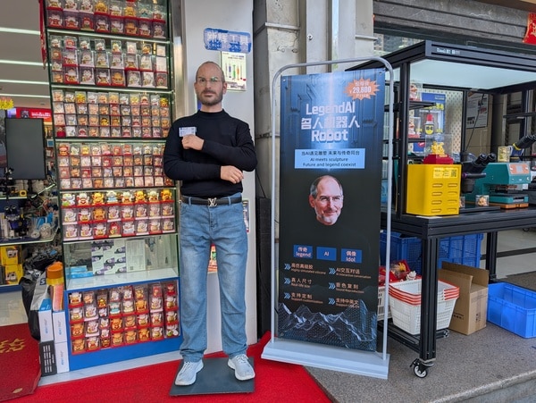 パソコン、携帯電話、LED製品、ドローン、VRグラス、暗号通貨のマイニングマシーンなど、深圳の「看板」はめまぐるしく移り変わってきたのだが、今はロボットと低空経済が熱い。世界最大の電気街・華強北を歩いていると、この二つが繰り返しアピールされている。スティーブ・ジョブズを模した人形は「本物そっくりのシリコン・フェイスで、インタラクティブな対話が可能なAIロボット」とのこと。体が動くわけではなく、一般的なAIチャットボットと同じものと思われる。ジョブズAIと会話するだけならスマホやタブレットで十分だが、人型ロボットブームにあやかって体を全部作ってみたということだろう。