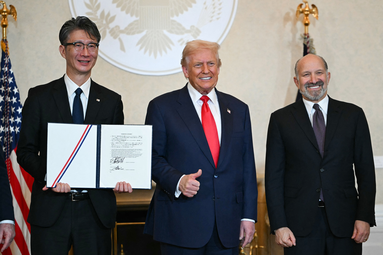 多くの先進国で政策不確実性が高まる中では、「動かない」ことはリスクでもある[トランプ大統領(中央)とラトニック商務長官(右)は対米投資プロジェクトに関心を示した企業を招きイベントを開催。左は東芝の島田太郎社長=2025年10月28日、東京](C)AFP=時事