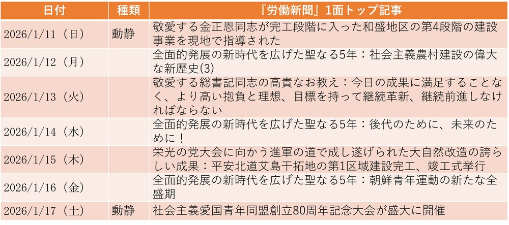 17日付は、社会主義愛国青年同盟創立80周年記念大会が平壌(ピョンヤン)の金日成(キム・イルソン)競技場で開催され、金正恩(キム・ジョンウン)国務委員長が演説したことについて報じた。青年組織のイベントにもかかわらず、金正恩の娘は不参加であった。