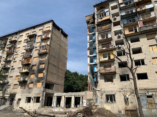 市内西部の幹線道路から少し入ると、ソ連時代のアパートが並ぶ。その一角で、横に長い9階建てコンクリート製の1棟が真ん中で2つに割れていた。当日の午前4時前、このアパートの中央の3、4階部分にミサイルが着弾し、上下の居室を巻き込んで崩れ落ちた。