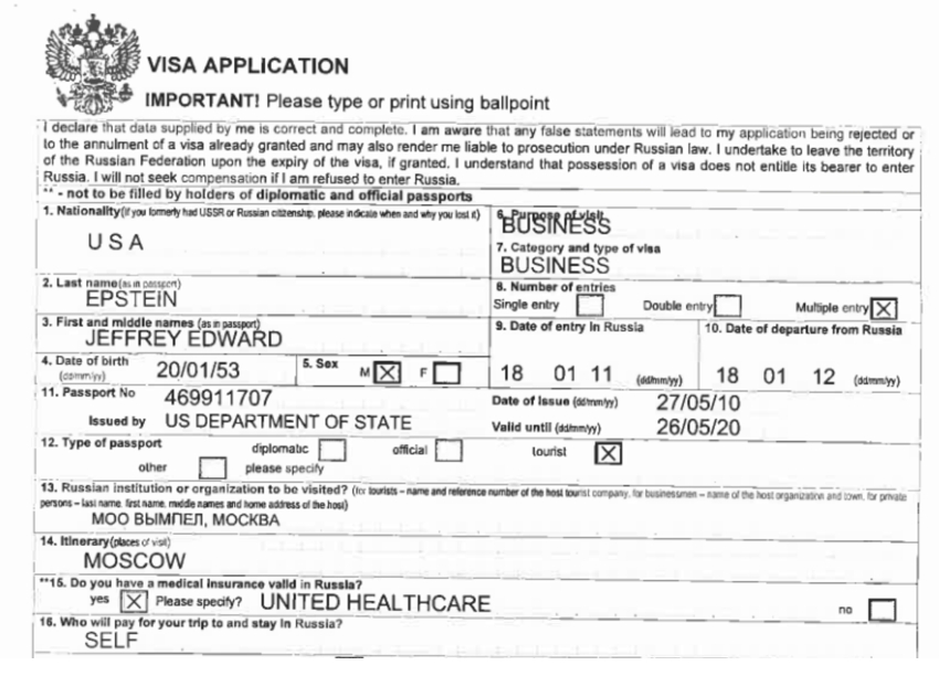 エプスタイン文書の中では初期のロシア・コネクションは、2010年11月にソ連生まれスウェーデン国籍の富豪ウラジスラフ・ドローニンがエプスタインをカイロのパーティに招待するやり取りに確認できる。「ロシア渡航に査証は必要? プーチンの友達を知っている。彼に頼んだらよいか?」と聞くエプスタインに対し、ドローニンはロシア査証の支援を申し出ている12。