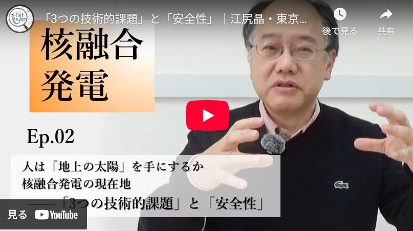 長野光と関瑶子のビデオクリエイター・ユニットが、現代のキーワードを掘り下げるYouTubeチャンネル「Point Alpha」。今回は、核融合発電が直面する課題や安全性の評価について、東京大学大学院新領域創成科学研究科教授の江尻晶氏に話を聞いた。 ※主な発言を抜粋・編集してあります。