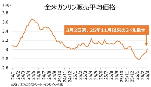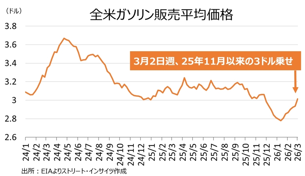今回、新たに加わった原油高はガソリン価格を押し上げ【チャート1】、家計を圧迫する。インフレ懸念を通じて金利上昇→株安につながり、中間選挙にも逆風となる。米債券運用大手PIMCOは、エネルギー価格が20%上昇すれば、消費者物価指数を1%ポイント押し上げると試算している。120ドルヘ接近したWTI原油先物は2月27日比で78%も急伸となり、95ドル付近へ下落した直近でも40%超の上昇だ。