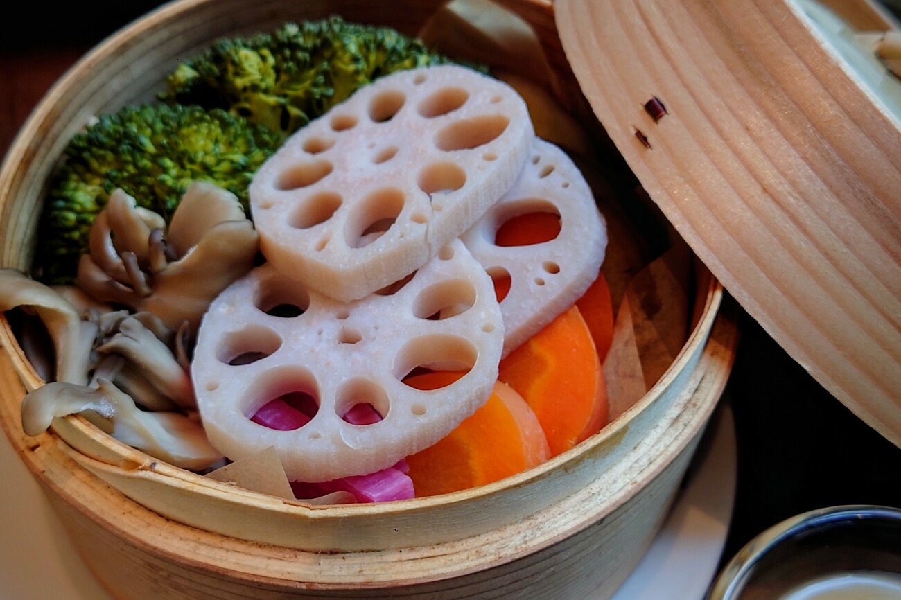 大根のすり流し。ふきのとう風味の胡麻豆腐。小さなセイロに入った蒸し野菜の数々。味噌やタレや塩につけて自由に食べられる形式になっていた。