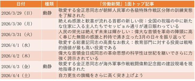 3月29日付は、金正恩が朝鮮人民軍総参謀部の作戦局直属特殊作戦訓練基地を訪れ、各級特殊作戦区分隊の訓練を視察したことについて報じた。努光鉄(ノ・グヮンチョル)国防相、朝鮮人民軍の李永吉(リ・ヨンギル)総参謀長、金成基(キム・ソンギ)総政治局長らが現地で金正恩を迎えた。金正恩は、「平時に訓練で汗を多く流せば、戦闘で血を少なく流すという哲理」を強調し、特殊作戦陣容の再編方針を提示したという。