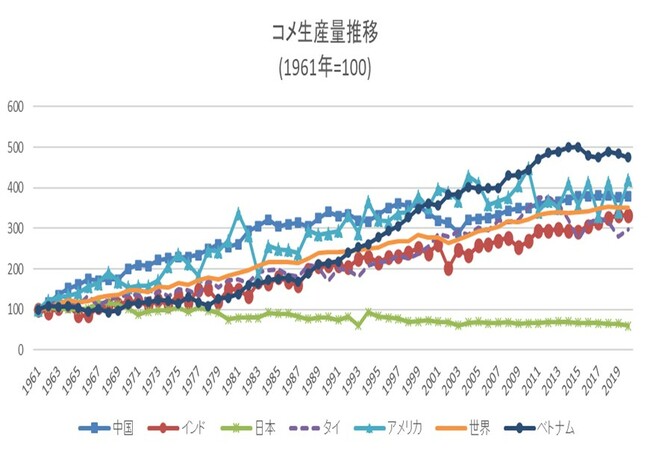 下に示すグラフは1961年を100として見る、ここ60年間の各国の米の生産量の推移である。世界の米生産が3.5倍に増加した一方で、日本は4割の減少(1967年のピークからすれば半分以下)である。補助金を出してまで主食の米の生産を減少させている。そんな国が、どこにあるのか? JA農協は、最近「国産国消」を宣伝している。しかし、JA農協がやってきたことは、国産の“米殺し”だ。