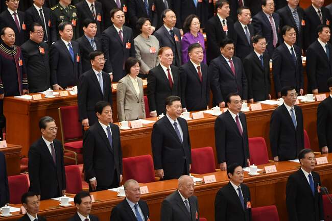 2019年3月13日、全国政治協商会議の閉会式で国歌を歌う(2列目左から)趙楽際、栗戦書、習近平、李克強、王滬寧の各氏 (C)AFP=時事